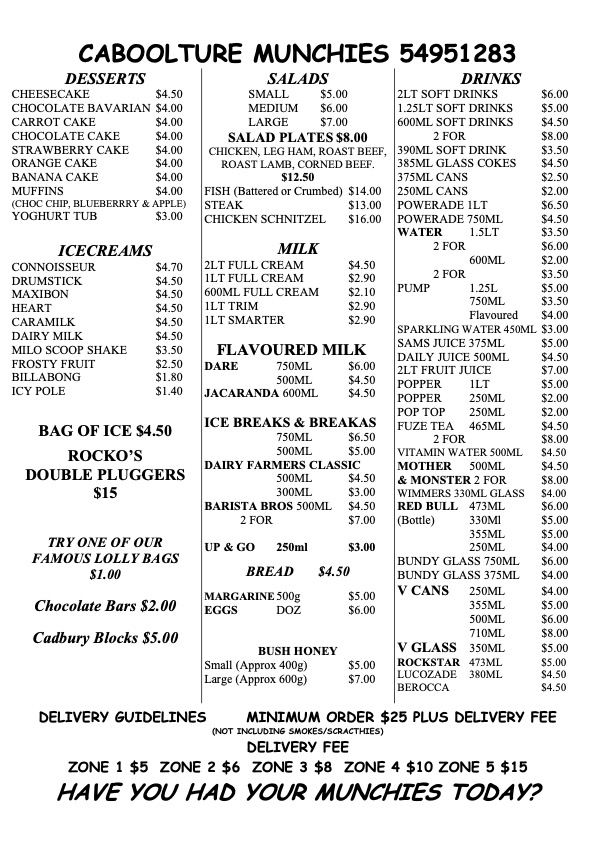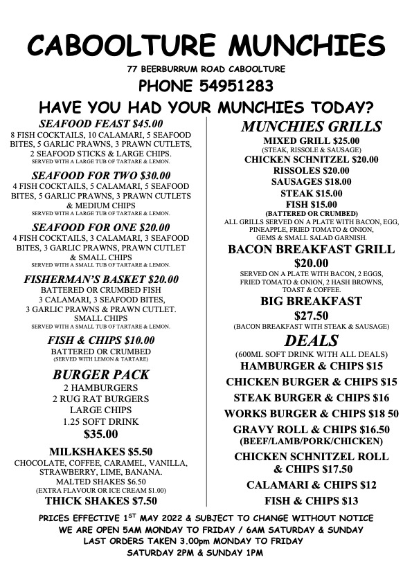 Introducing the menu at Caboolture Munchies, a delightful café situated on Beerburrum Rd in Caboolture, QLD. This hidden gem offers a mouth-watering selection that caters to every craving. For those looking for a hearty meal, their Munchies Grills are a must-try. Options like the Chicken Schnitzel and Mixed Grill promise satisfaction, while the Super Hot Dog is a flavorful treat that's sure to please. Customers rave about the fresh ingredients, like in the delightful $8 burger—perfectly cooked and served with a smile.